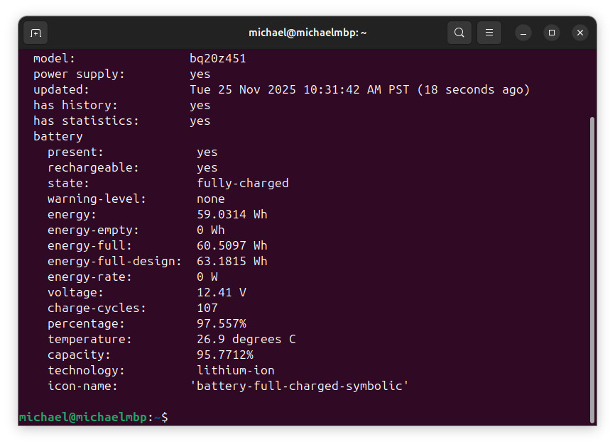 Checking the battery status told us someone had replaced the battery at some point. It only had about 100 cycles on it, and the calculated health/capacity was about 95%. Nice! An hour of web browsing later, we still had over 60% state of charge – which means we should have a usable runtime of about three hours.